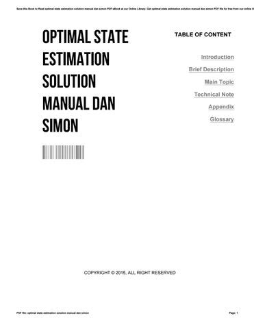 Read Online Optimal State Estimation Solution Manual Dan Simon Download Doc By Click Button. Optimal State Estimation Solution Manual Dan Simon Download it’s easy to recommend a new book category such as Novel, journal, comic, magazin, ect. You see it and you just know that the designer is also an author and understands the challenges involved with having a good book. You can easy klick for detailing book and you can read it online, even you can download it